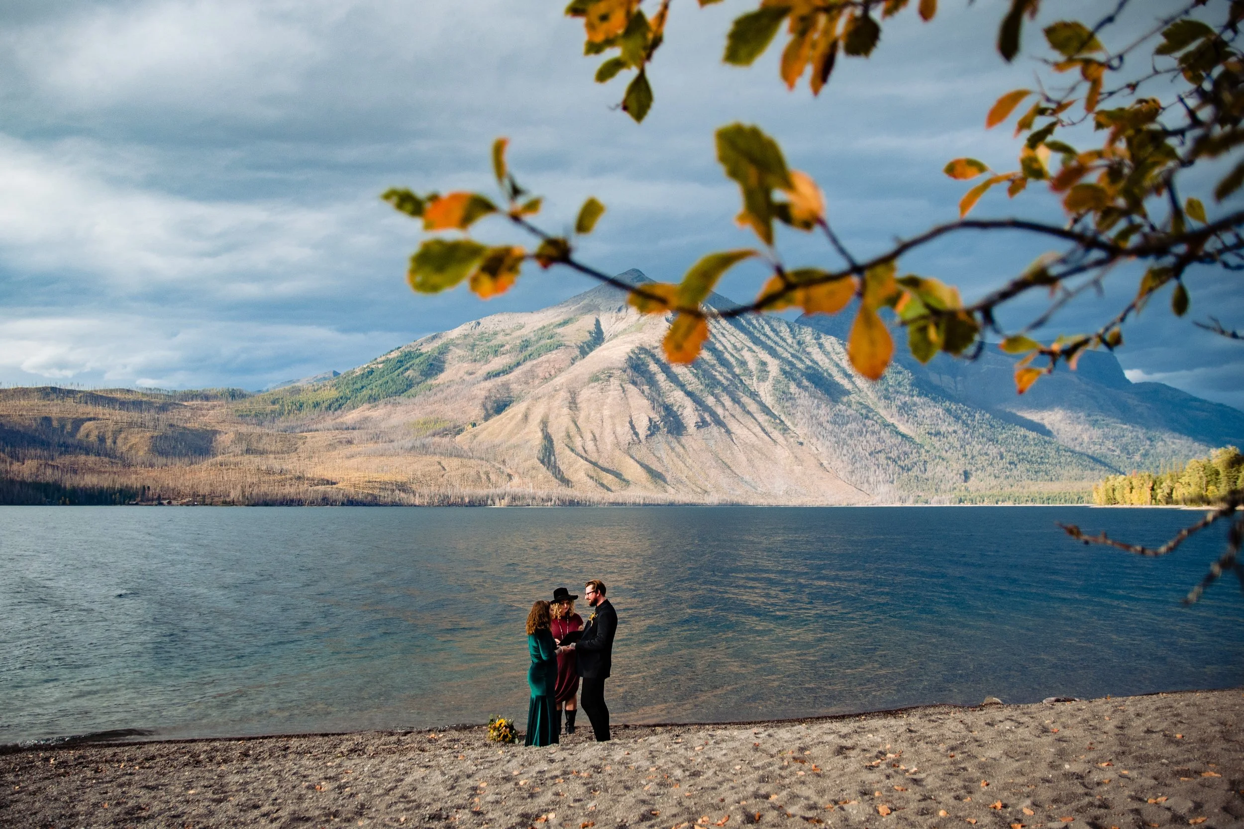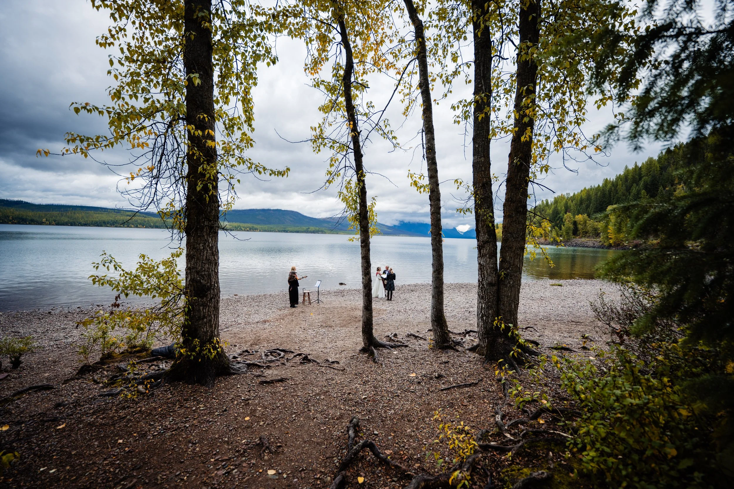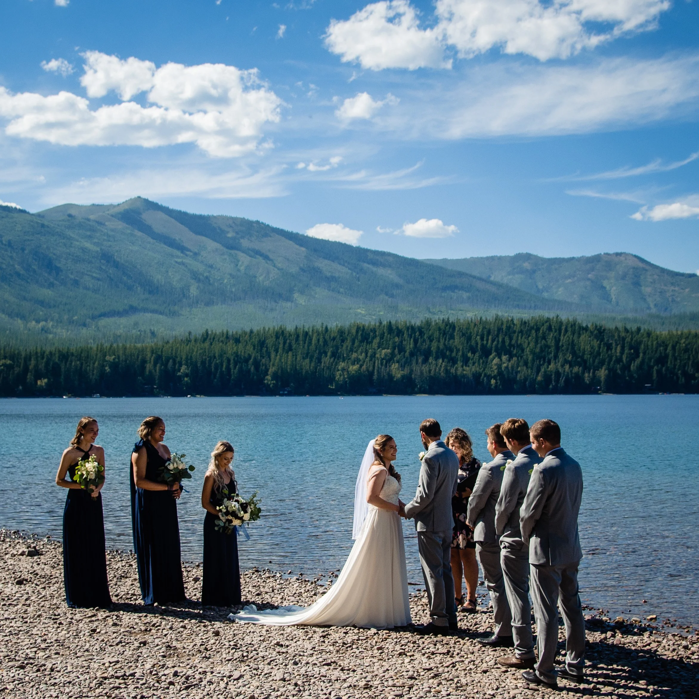 By far, the most popular after looking through my archives of YEARS of ceremonies- is Ryan Beach. We love this area as it’s semi-private (Apgar beach is across the creek so it can get noisy with other vacationers and locals utilizing the beauty of the Mountain View). But we’ve done all seasons here and it’s always a sight! You really can’t beat those Glacier National Peaks as your backdrop. It’s a lovely little treed walk in. You can either stand on the rocky shoreline or up on the grass, either way, you still have THIS VIEW!!!